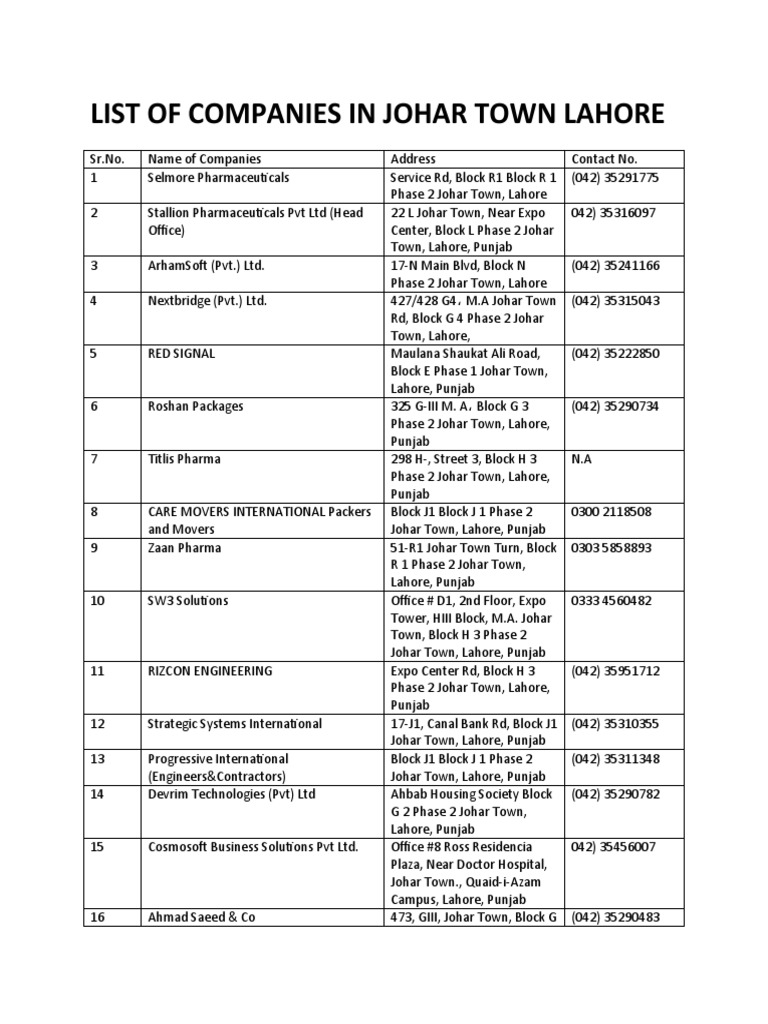 List Of Companies In Johar Town Pdf Economic Sectors Business